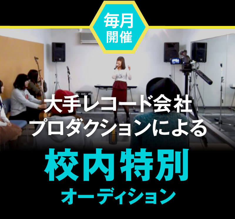 下記レコード会社とプロダクションによる校内特別オーディションを毎月開催中です。新人発掘セクションの方々に、1人ひとり直接歌を聞いて審査していただけるオーディションです。
