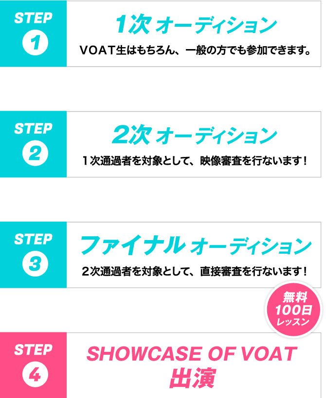 「ショーケースオーディション」はショーケースオブVOATの出演者を選抜するオーディションです。1次オーディション→2次オーディション→ファイナルオーディションまであり、ファイナルオーディション通過者はショーケースオブVOATに出演することができ、本番当日までに「無料100日レッスン」で養成します。