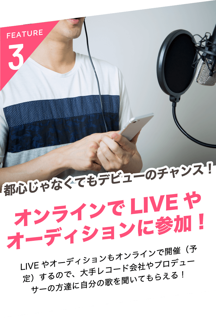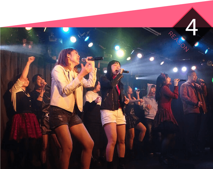 コース問わず、レッスンの成果を発表する場を多数ご用意しております。「VOATライブ」では有名アーティストと同じステージに立てるチャンスも!また、「オーディション」は音楽業界30社が来場し、その場で出演者をスカウトするなど、デビューのチャンスがあります。