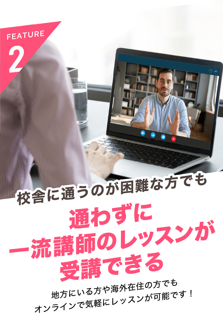 地方の方や海外在住の方でも大丈夫!家庭の事情などでスクールに通うのが難しい(自宅で受けたい)方は校舎に通わなくてもオンラインで一流講師のレッスンが受講できます!もし来校して受講される場合でも1人1スタジオ使用できるので安心です。